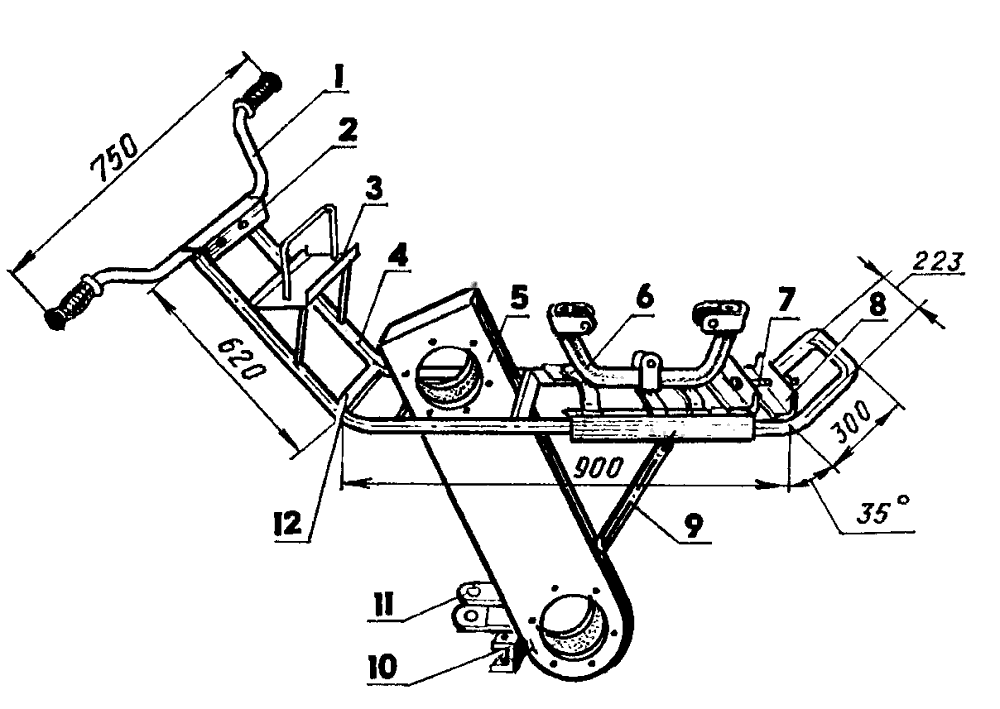 1– руль; 2– держатель панели приборной; 3– площадка для установки аккумулятора; 4– швеллер (лонжерон); 5– картер; 6– станина; 7– натяжитель цепи; 8– упор натяжителя цепи; 9– подкос; 10– держатель крепления подрамника; 11– кронштейн, соединяющий культиватор с адаптером или прицепом; 12- поперечина.