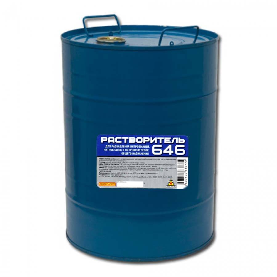 Растворитель 646, который рассчитан на использование с нитроэмалями и нитролаками, эпоксидными и глифталевыми грунтовками, после полного испарения придает лакокрасочному покрытию дополнительный блеск. Данный разжижающий состав наиболее активный среди аналогичных средств, поэтому при его использовании необходимо соблюдать аккуратность, чтобы случайно не повредить нижний слой лакокрасочного покрытия.