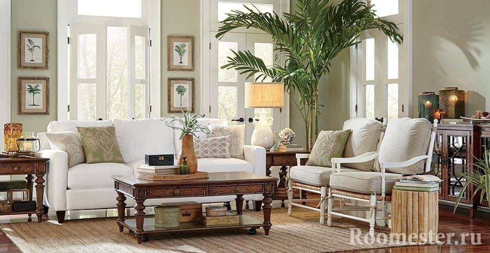 В классической гостиной гармонично будет смотреться мягкая мебель с оливковой обивкой и деревянными элементами.