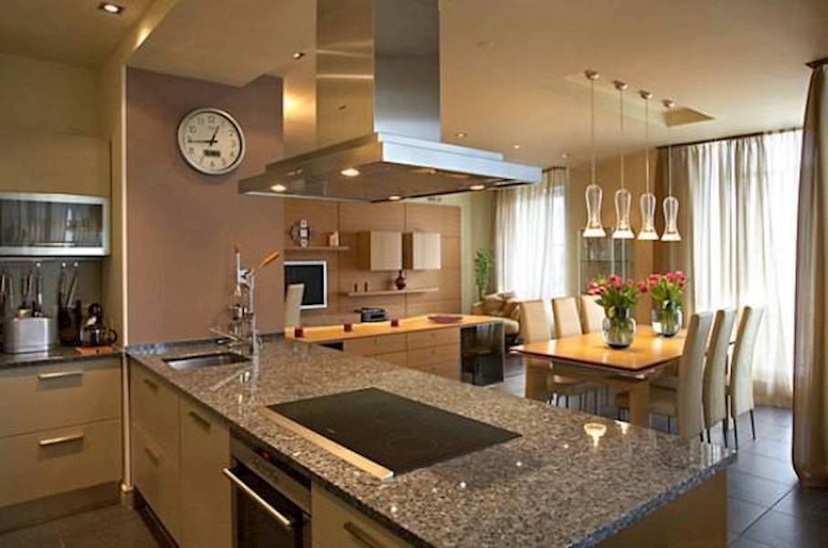 помните о том, что в жилом помещении нельзя устанавливать газовую плиту. Если вы намереваетесь пользоваться этим прибором, то единственным способом объединения кухни с гостиной будет установка стеклянной перегородки между ними. Если же хочется простора, лучше использовать электрическую плиту и духовой шкаф;