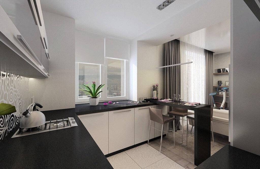 Барная стойка – отличное решение для зонирование маленькой кухни-гостиной или студии, позволяющее убить сразу двух или даже трех зайцев – зонировать, создать дополнительную рабочую поверхность и компактную обеденную зону.