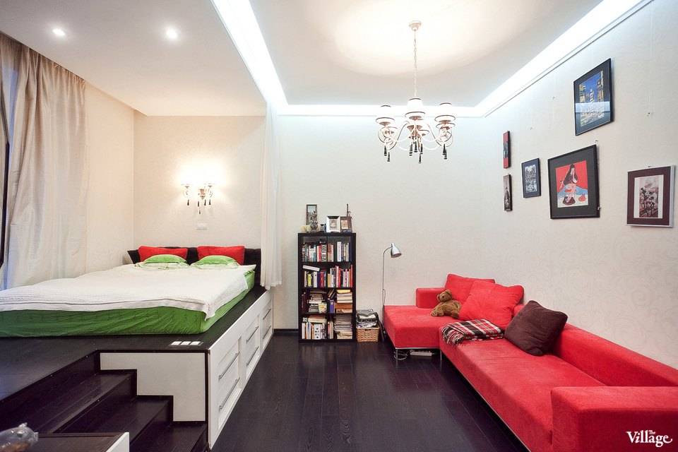 Подиум может выполнять не только функцию зонирования, но и хранения. В маленькой студии под ним можно оборудовать выдвижные ящики и даже спрятать кровать.
