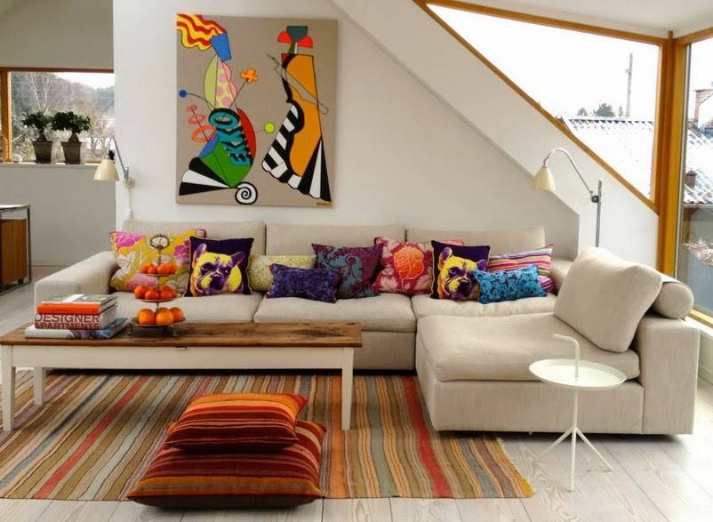 Учитывайте размер помещения. Яркий интерьер для маленькой комнаты не подойдет. Он визуально уменьшит помещение. Если хочется больше насыщенности, используйте яркие цвета в деталях. Цветные подушки, текстиль, яркие фотографии, зеленые растения, различные декоративные элементы сделают интерьер интереснее. Фон лучше оставить светлым.