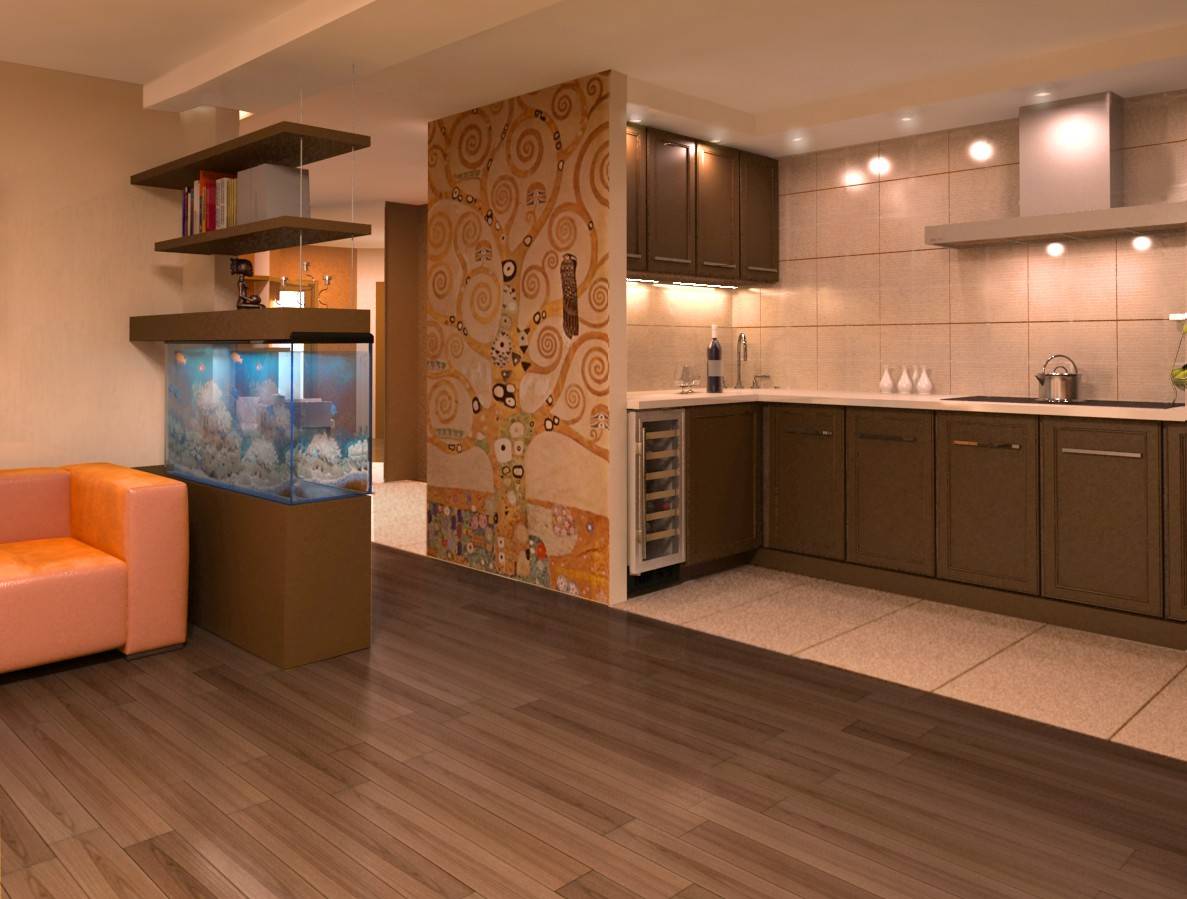 напольное покрытие в кухонной зоне должно быть устойчивым к воздействию влаги. При этом нужно чтобы оно гармонировало с полом в гостиной.
