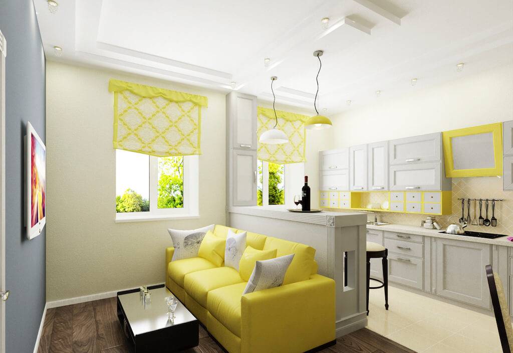 Самый простой и наименее затратный способ разграничить пространство – расположить мебель не у стен по периметру, а посередине комнаты – например, установив диван спинкой или перпендикулярно к кухонному гарнитуру.