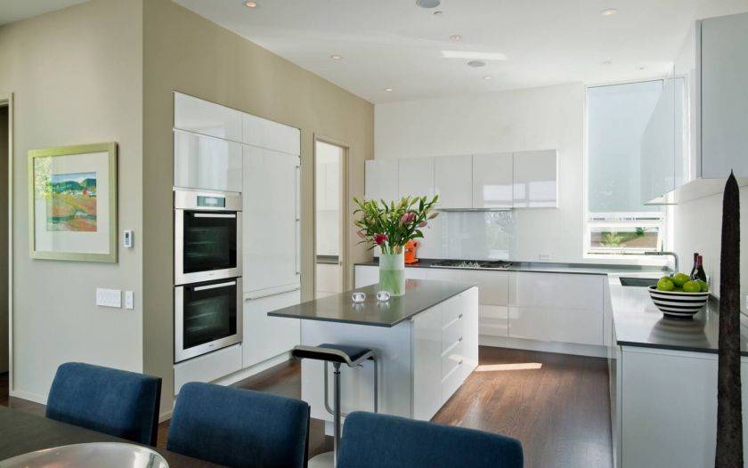 Переходным звеном между кухней и гостиной может выступать обеденная зона.