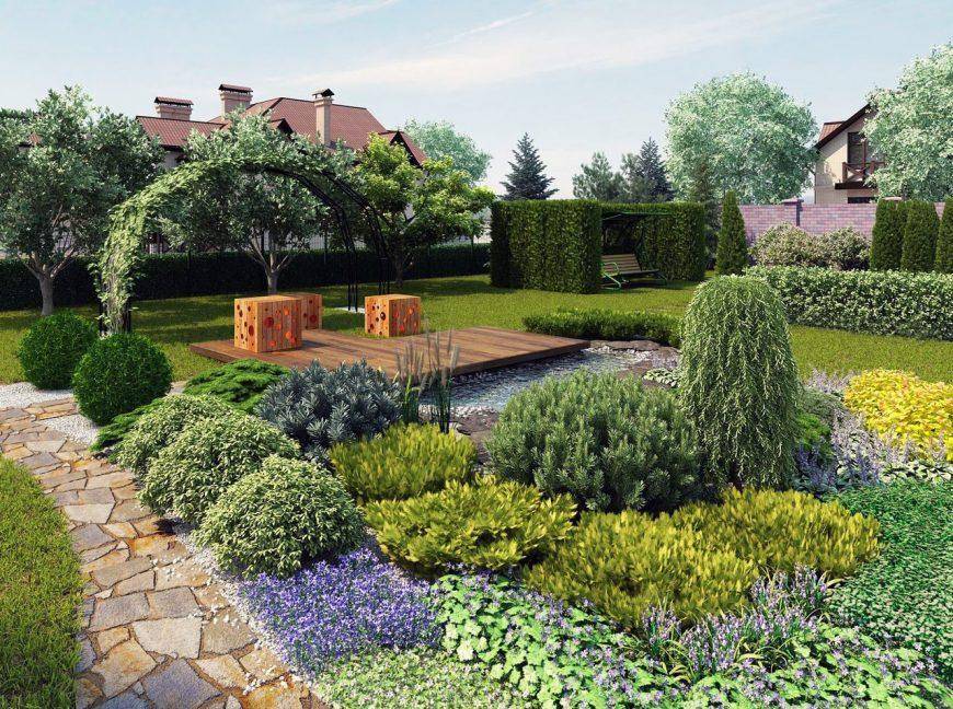 Существует множество уже готовых ландшафтных дизайнов участка, достаточно выбрать один из них, а затем применить к своему пространству.