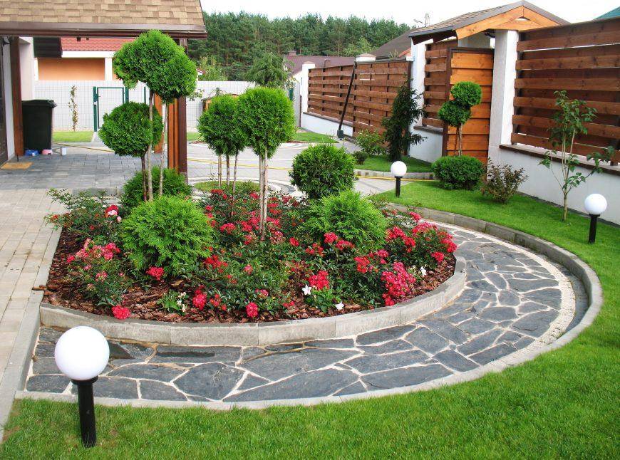 При поиске места для дома необходимо учесть варианты подхода к нему – нужны тротуары, площадки для автомобиля или гараж (правила строительства гаража на участке описаны в статье). Эта зона будет технической и декоративной. Она располагается со стороны входа во двор, поэтому формирует его внутренний облик, который первым будет представать перед хозяевами и гостями.
