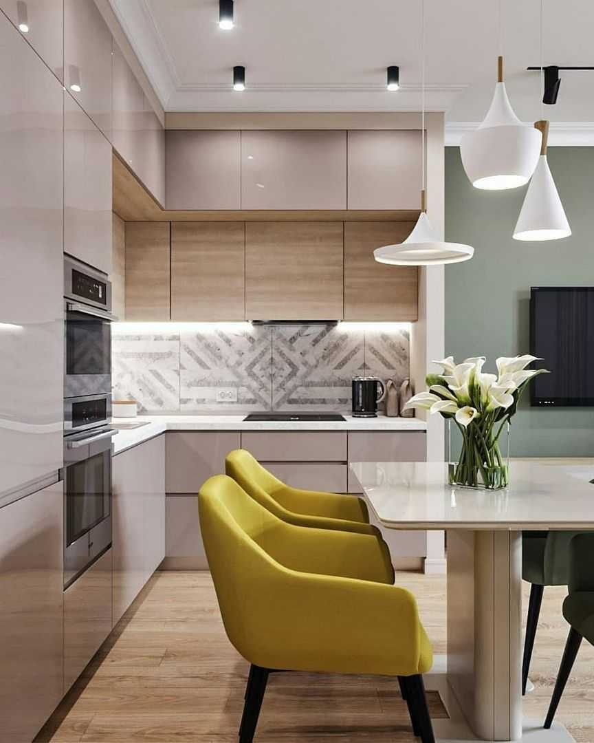 Подобная планировка не только экономит место, но и позволяет делить помещение на различные функциональные зоны. Расстановку мебели и техники начинают с углового сегмента, размещая их вдоль двух стен. Гарнитур, стоящий у короткой стены, рекомендуется сделать узким.