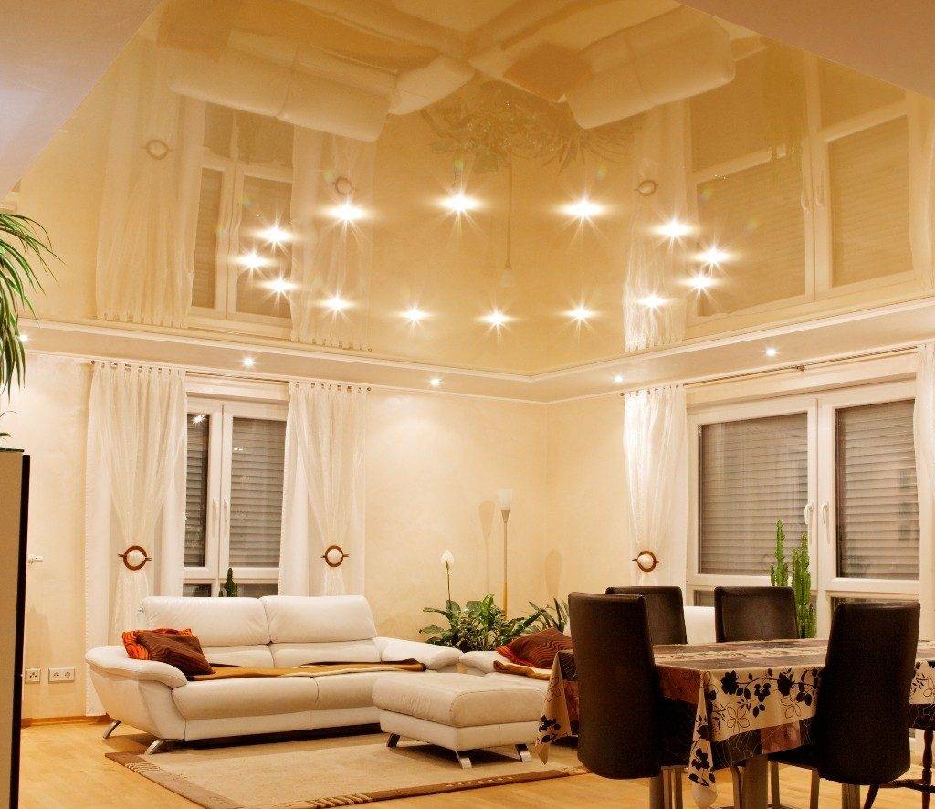 А ещё лучше – использовать многоуровневое освещение, где существует несколько световых режимов. Например, задействовать напольное освещение, которое будет отражаться в зеркальном потолке. Интересно смотрится потолок, освещенный светильниками-бра, направленными лампами вверх (или двухрожковыми светильниками, с лампами вверх-вниз). Наиболее «высоко» выглядит светлый глянцевый потолок с рассеянной подсветкой по периметру.