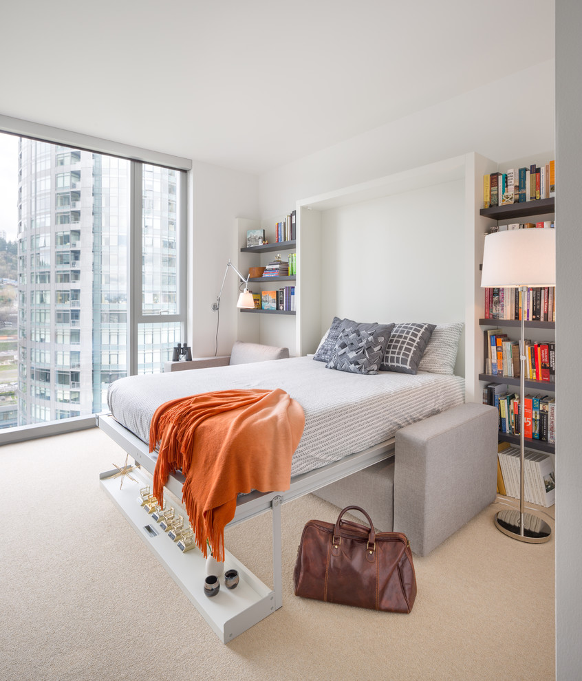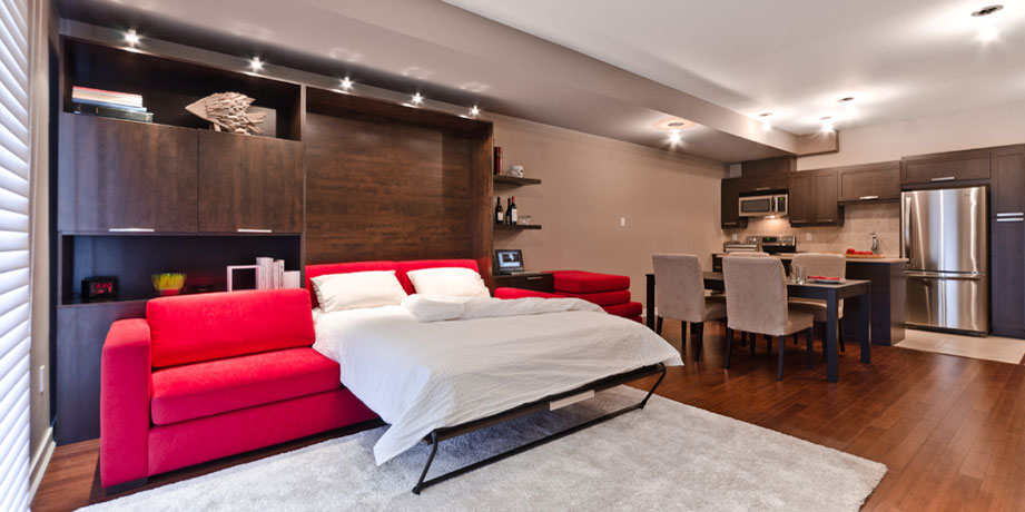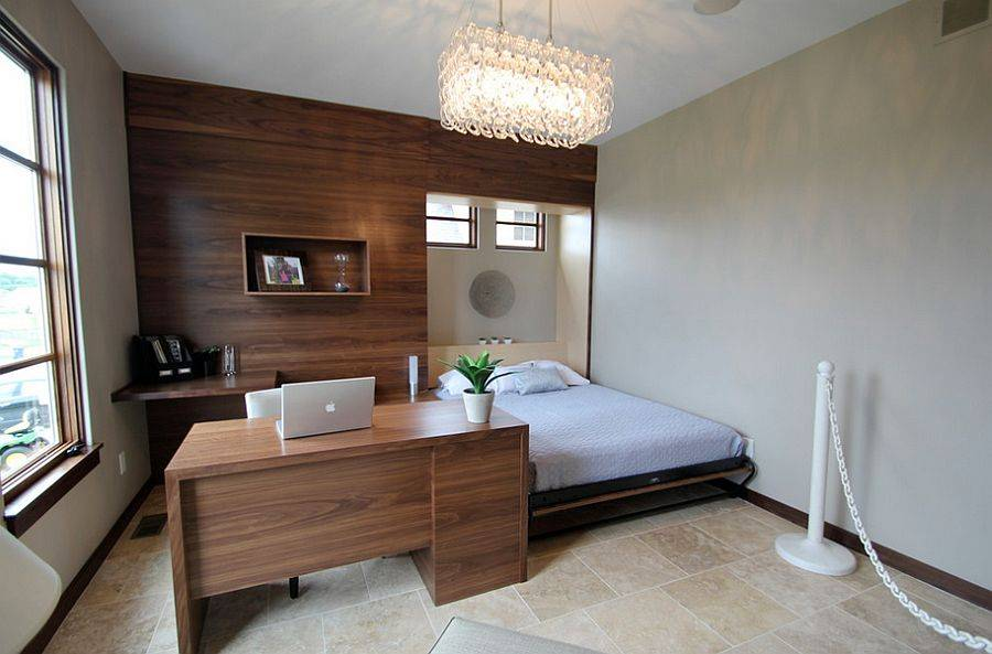 Использование неудобных участков комнаты. Для участков помещения, где невозможно было бы поставить полноразмерную мебель, отлично подойдет кровать трансформер, которую можно разместить даже в углу.