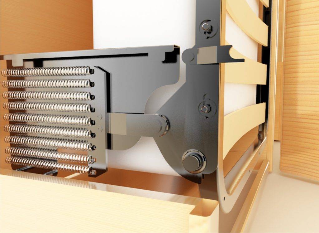 В пружинном механизме перемещение мебели обеспечивается витыми пружинами из прочной, но в то же время эластичной углеродистой проволоки. Это надежный механизм: его работа рассчитана как минимум на двадцать тысяч циклов трансформации кровати. Единственный недостаток такой конструкции состоит в том, что со временем пружины начинают скрипеть.