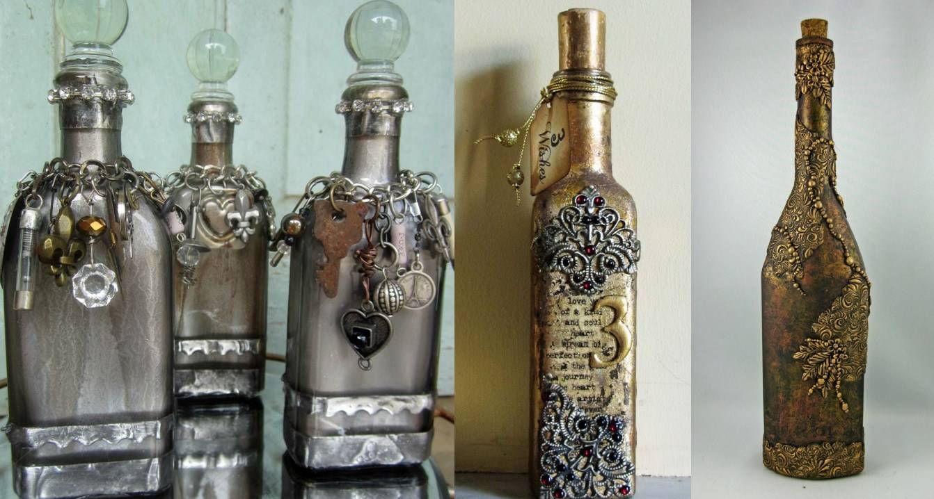 В лофт и современный интерьер стоит подбирать однотонные, простые способы декора бутылок. Возможно добавление металлических элементов из проволоки, окрашенной в матовый цвет. Интересно будет сочетаться с дизайном помещения бутылка, оформленная с использованием яичной скорлупы в черно-белой гамме.