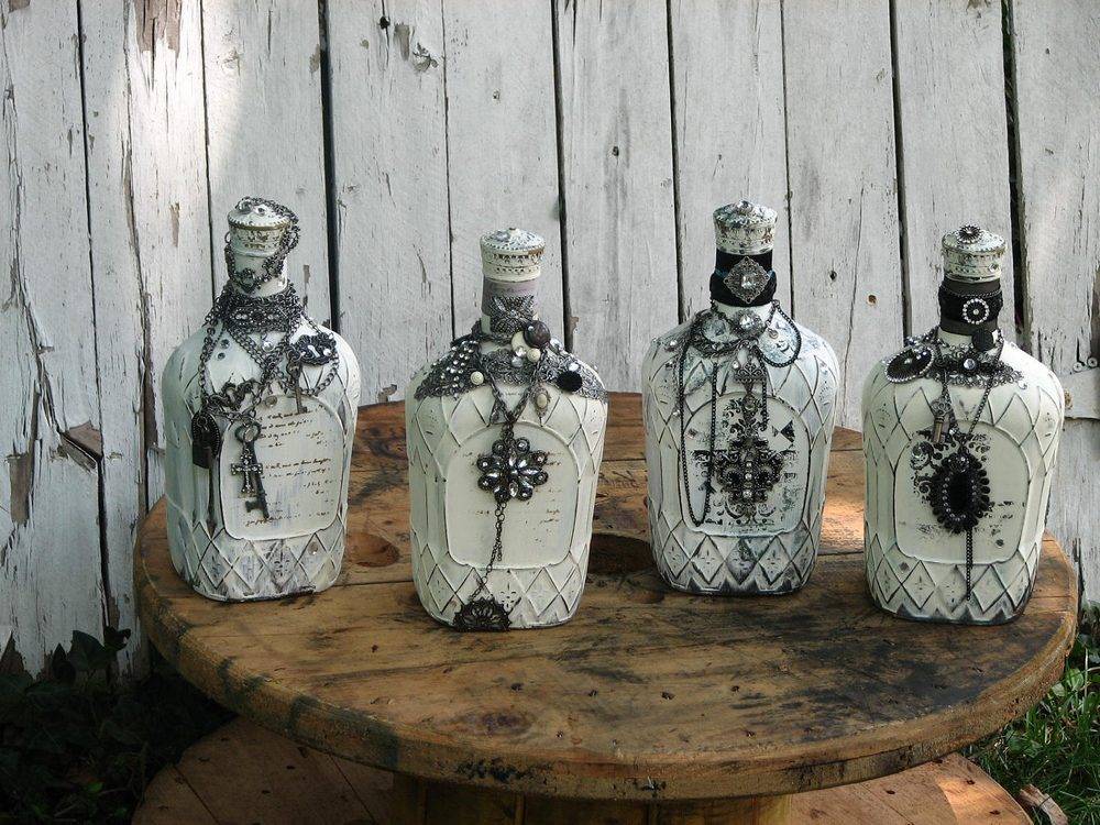 Декорированные бутылки часто используются для интерьера, созданного с уклоном на какую-то конкретную тематику или стиль. Как красиво не была бы оформлена бутылка, в первую очередь она должна подходить по стилю. Для уютной гостиной с камином, оформленной с уклоном на уютную осеннюю тематику, стоит выбрать баночки с декоративным консервированием, окрашенные в теплые тона (бордовый, оранжевый, кирпичный) с элементами из грубой нити, сухоцветов или круп.