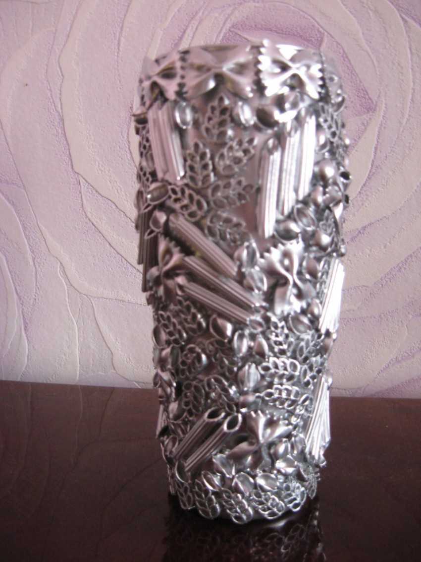 Карандашница изготавливается на основе любого стакана. Можно для каждого ряда брать разные формы, а для рельефа поверх готового цилиндра наклеить украшения из макарон-бантиков.