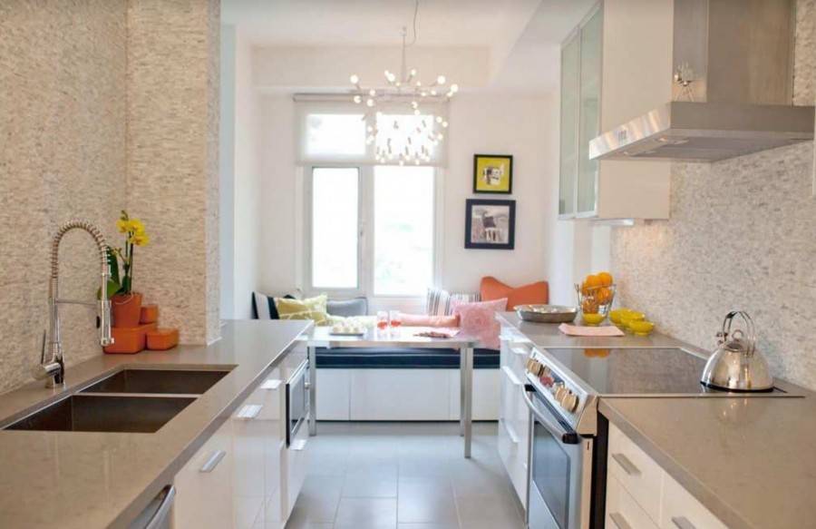 Если пространство узкое и ограниченное, как в небольших домах или квартирах, планировка в варианте коридора часто является единственно возможным видом дизайна. Здесь две стены со шкафчиками обращены друг к другу. При этом размещаются все необходимые приборы. Кухня 12 кв.м может быть открыта с обеих сторон, что прослужит проходом между жилыми комнатами. Одна из двух оставшихся стен может содержать окно или внешнюю дверь.