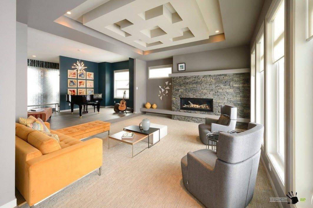 Модерн сочетает идеи практичности и удобства. Гостиную обычно оформляют с зонированием пространства, с подиумами и разноуровневыми потолками. В интерьере преобладают светлые тона, современные материалы.