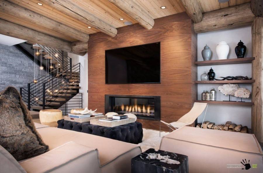 В стиле шале оформляют высокие большие гостиные, так как на потолке должны быть деревянные балки, мебель массивная, с эффектом состаривания, уместны камины. Вместо картин для украшения используют чучела животных, которых добыли на охоте хозяин и его предки.