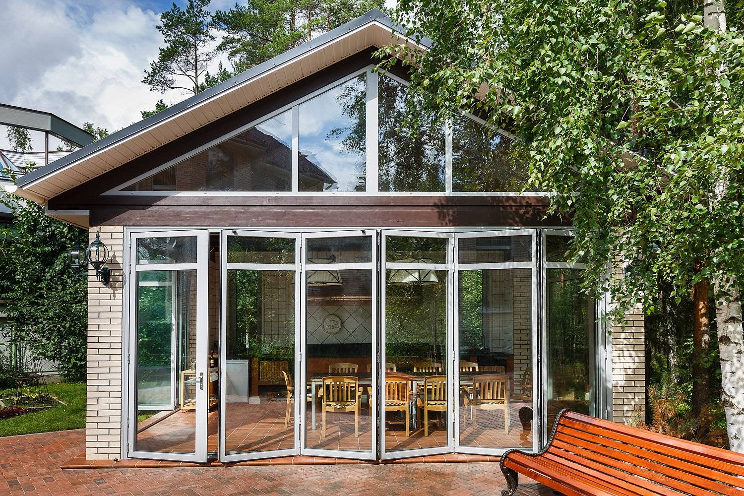 Терраса с раздвижной стеной из полимерного профиля имеет строгий, презентабельный вид. Из ПВХ изготавливают как «холодные», так и «теплые» системы.
