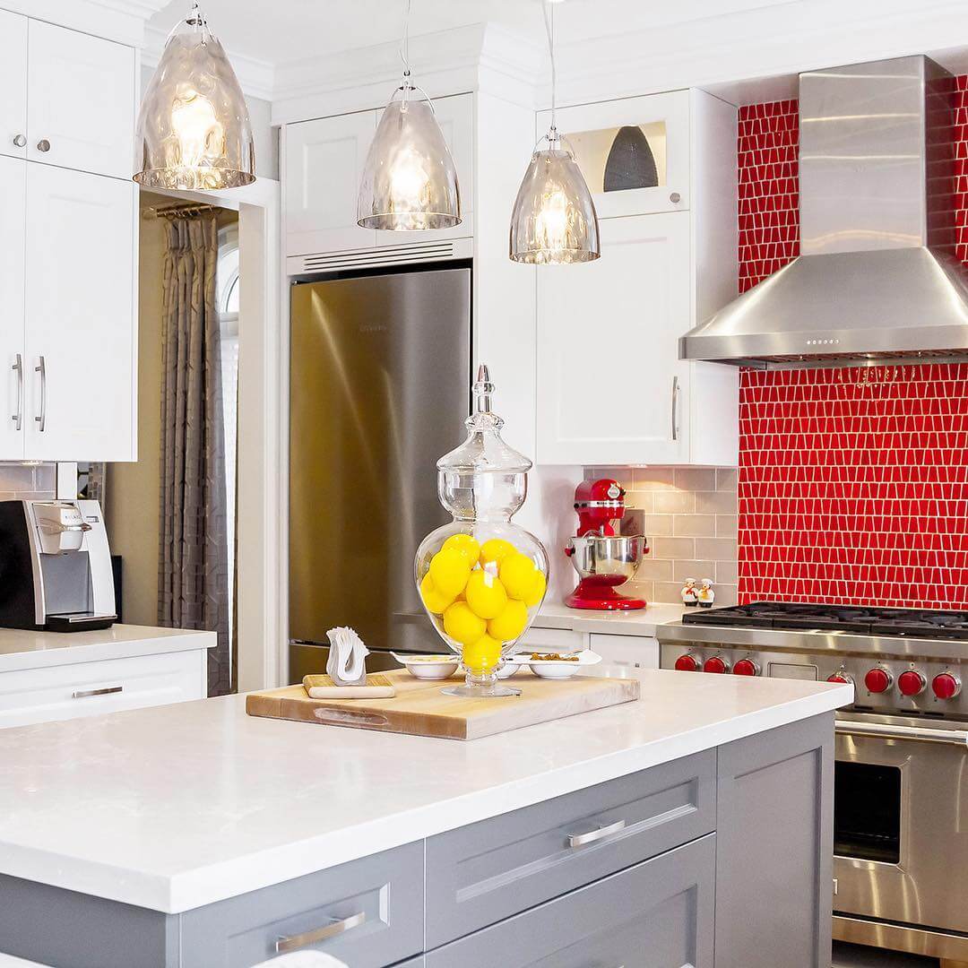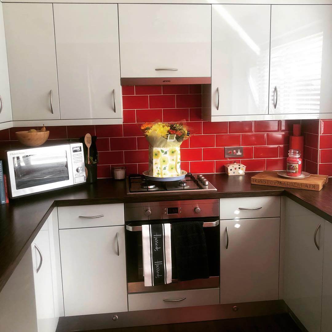 Кухня с красным плиточным фартуком и того же цвета акцентами на деталях: стильно, модно, молодежно.