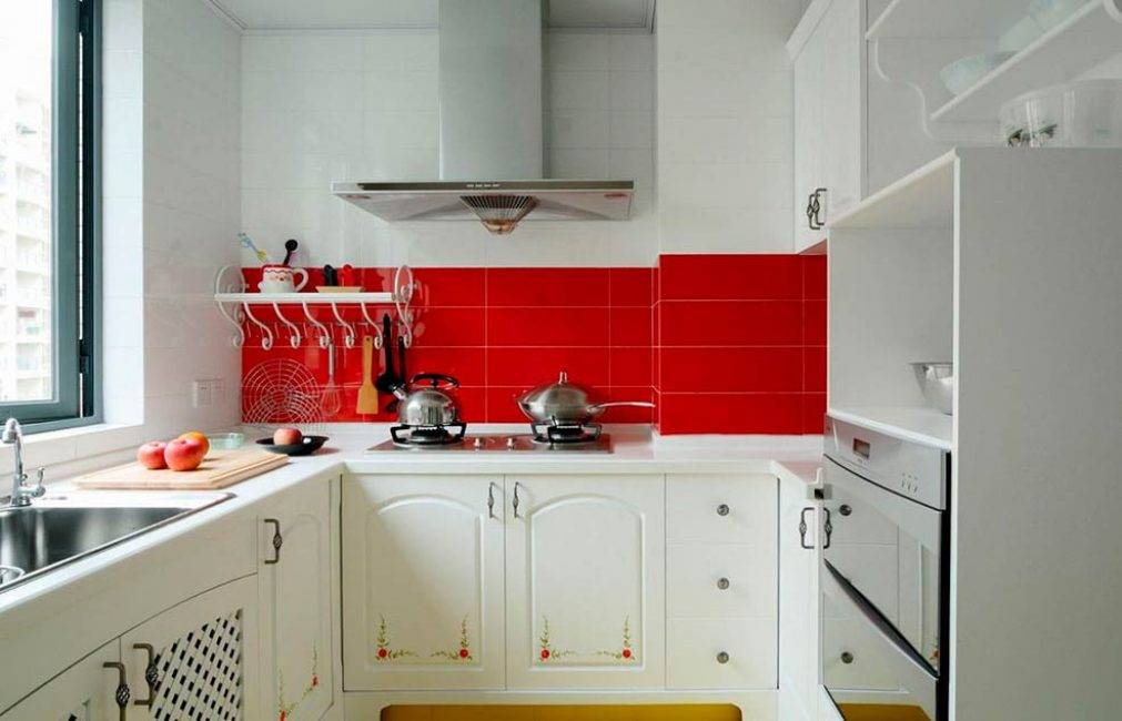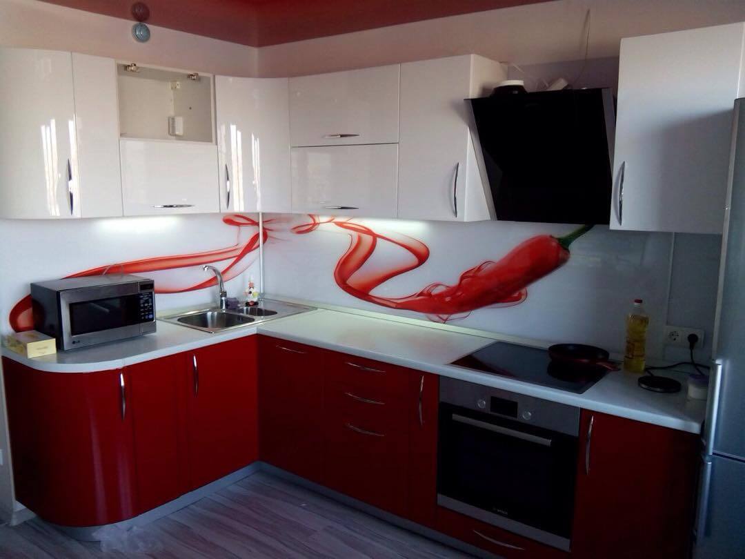 Свежести и живости дизайну красно-белой кухни придаст цветной фартук. Он может быть выполнен из любого материала – от мозаики до закаленного стекла. Очень стильно будет смотреться принтованный пластик и фотопечать.