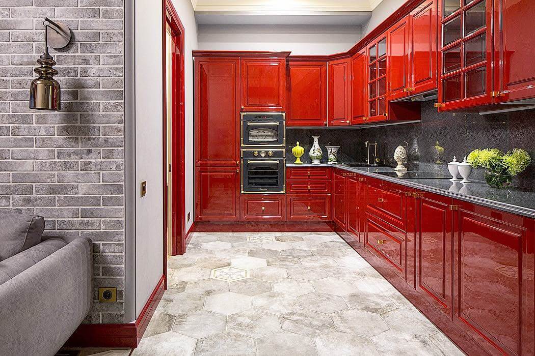 Когда вы войдете в кухню и увидите «красное море», глаз не заметит отдельных элементов, в том числе и пол.