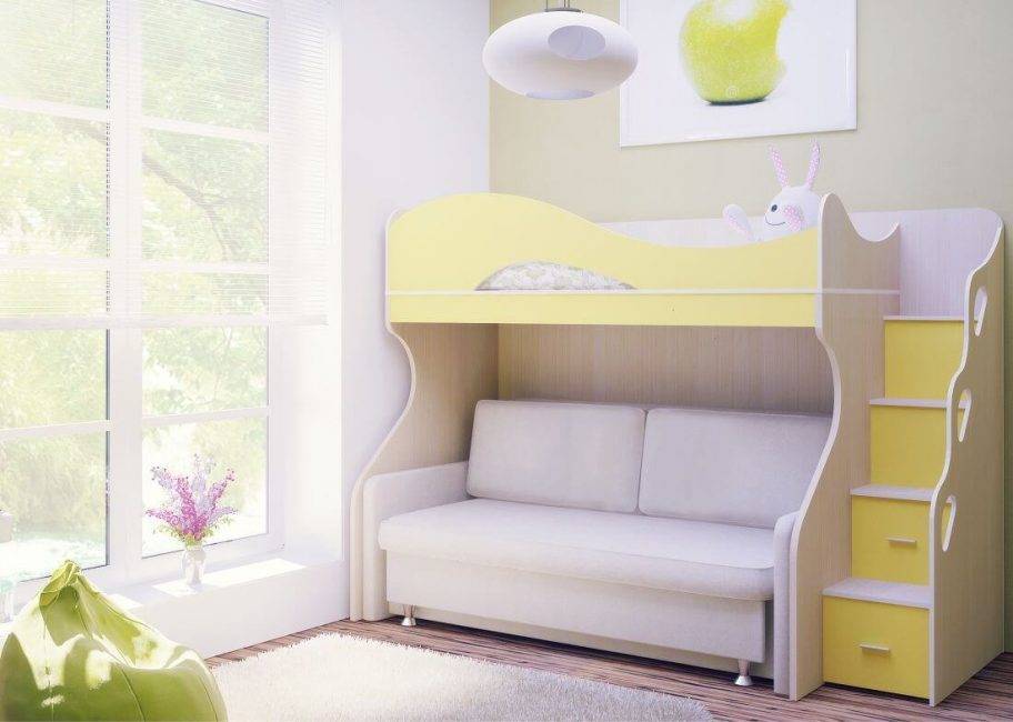 Также удачно сэкономить пространство помогут выдвижные кровати-диваны. Подобные модели после сна легко освободить и поднять (сложить, задвинуть), тем самым добавить в комнате места для игр и досуга.