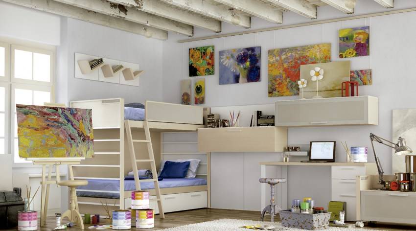- Для экономии пространства установите двухяруснаю кровать, если же площадь помещения позволяет вместить 2 отдельные кровати можете выбрать этот вариант.