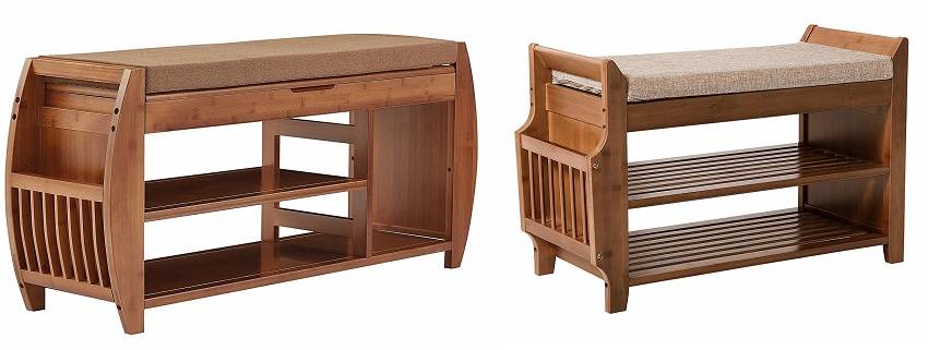 Древесина различных пород | экологическая чистота; плотная структура; красивый рельеф и оттенок; пластичность получающихся форм; вызывает приятные ощущения на ощупь; вносит определенную степень уюта в обстановку. | чувствительность к влаге; чувствительность к температурным перепадам; высокая стоимость; наличие возможности использовать лишь в помещении; необходимость в предварительном грунтовании различными средствами; высокая стоимость, особенно редких или ценных пород дерева; в деревянной подставке можно хранить только вымытую и высушенную предварительно обувь. |