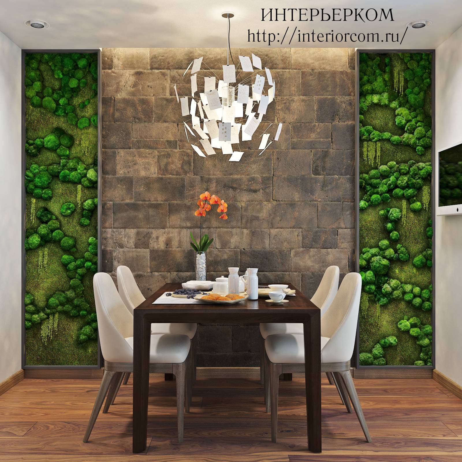 Ещё одним способом приблизиться к природе является оформление фитостены. Пожалуй, самый редкий и удивительный приём в оформлении интерьера, что в принципе логично, ведь он требует постоянного внимания и ухода. Тем не менее, это отличное решение для любителей растений, когда не хватает места для горшков, а душа просит зелени. Поскольку «зеленая стена» — это множество горшочков с землей, в которых разрастаются растения, образуя один сплошной ковёр, то не трудно догадаться, что эта конструкция съедает часть свободного пространства. Кроме того, требует света и постоянного полива. Но, согласитесь, выглядит просто шикарно!