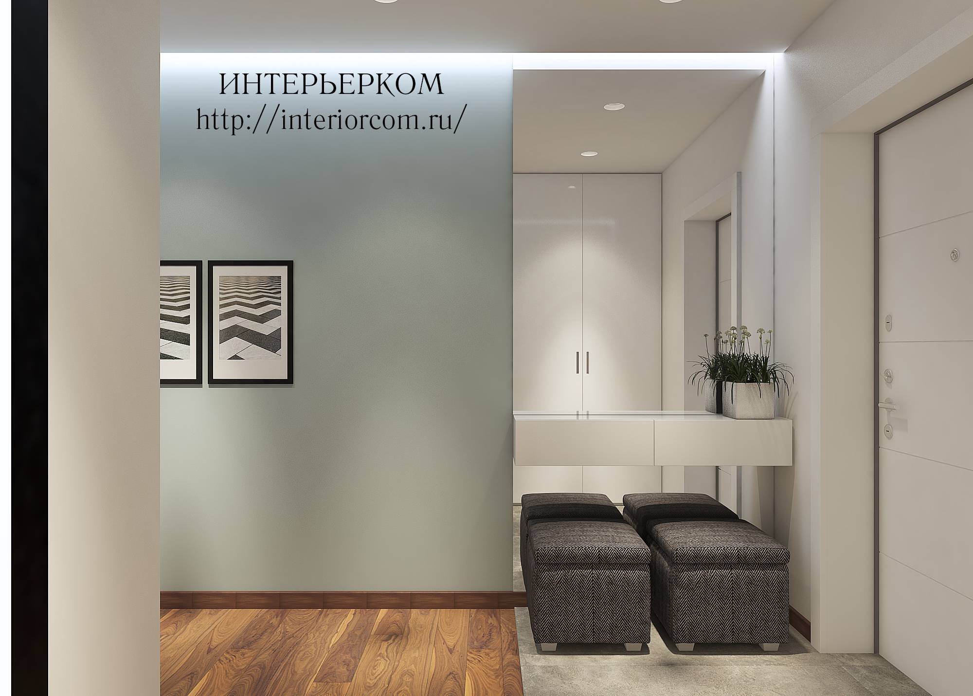А можно сделать попытку визуально расширить прихожую: зрительно отдалить противоположную от входа стену с помощью светлых, холодных оттенков.
