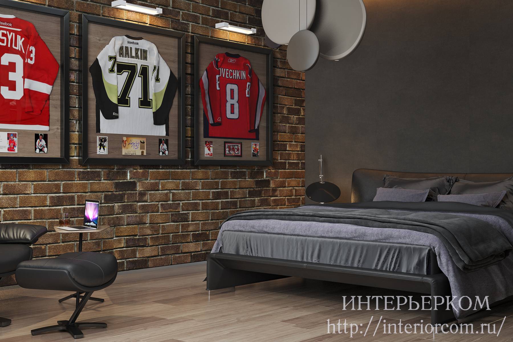 На фото: акцентная стена из кирпича и кожаных панелей, проект квартиры для мужчины