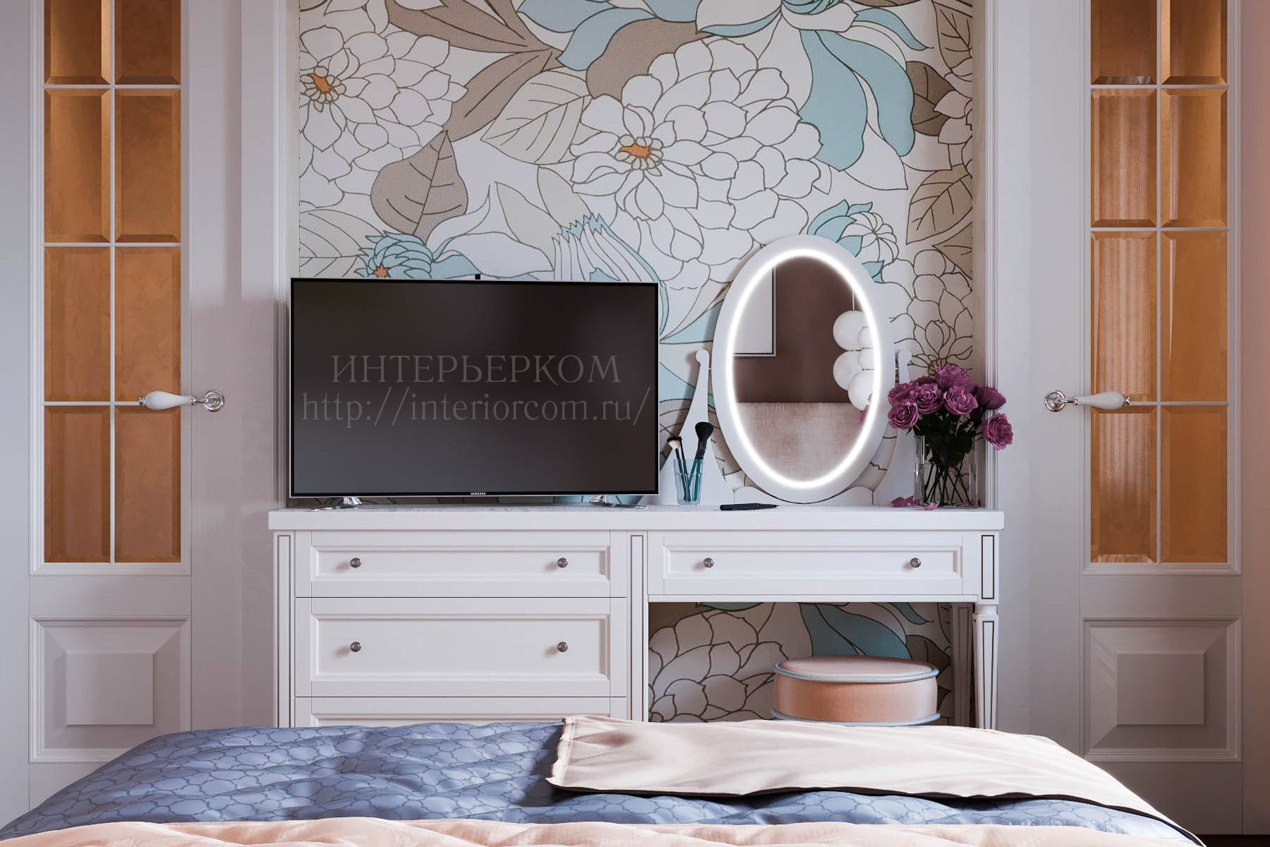 Довольно редко, но от этого не менее эффектно, делают один акцент за изголовьем, а второй – в зоне туалетного столика, интерьерной ниши или гардеробной.