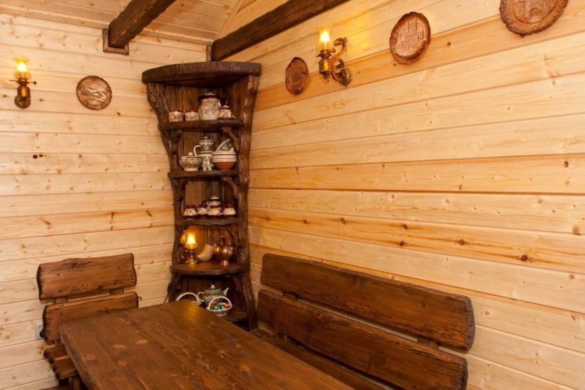 А из дополнительных деревянных аксессуаров можно сделать или заказать у специалистов резные светильники, вешалки, емкости для воды, всевозможные подставки и полки.