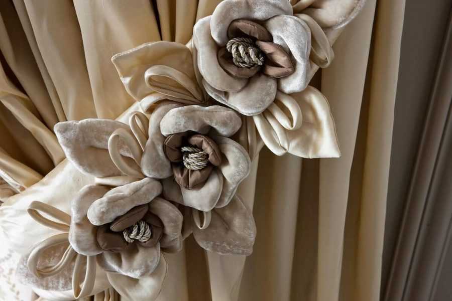 - Для классических портьер подойдут украшения, подчеркивающие фактуру ткани и создающие складки. Уместны будут различные подхваты, завязки, броши с зажимами.