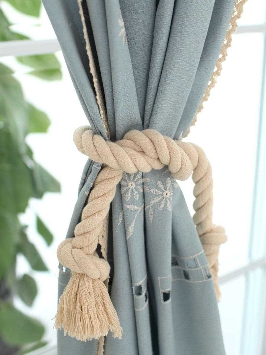 Средиземноморский. В комнате с намеком на морскую тематику уместно смотрятся плетеные фиксаторы, напоминающие канаты. Их можно дополнительно декорировать ракушками, морскими звездами, хрустальными и акриловыми бусинами, или декоративными безделушками в виде якорей.