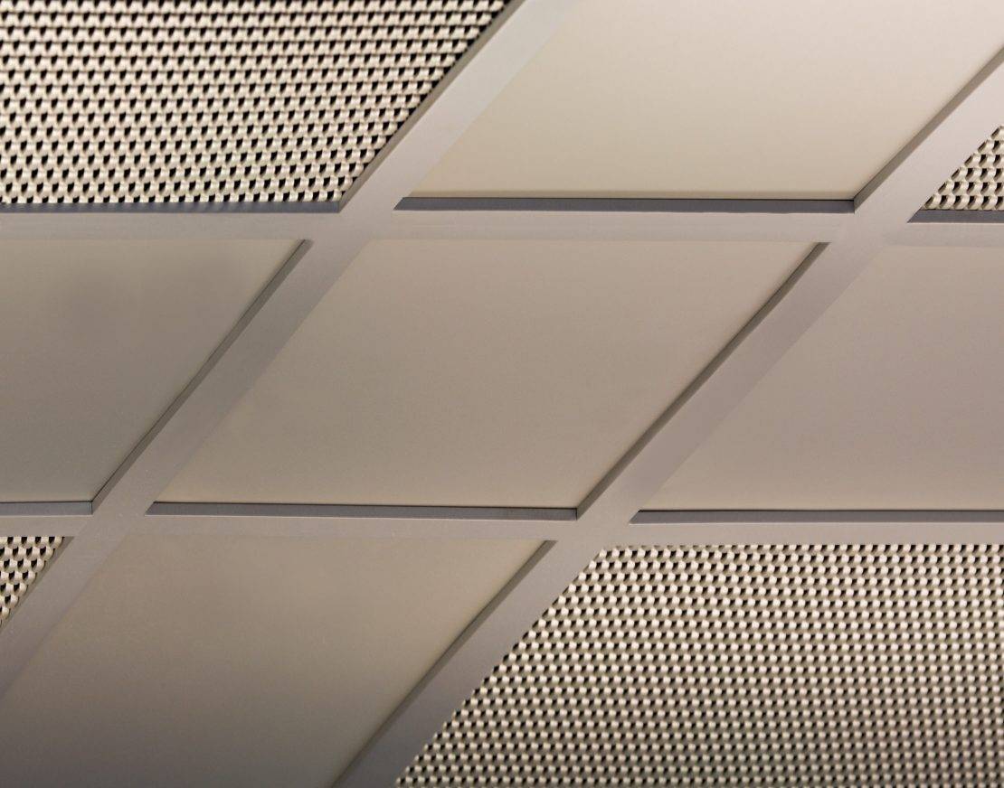 Также к преимуществам потолков Армстронг относят легкий вес. Каркасная система позволяет скрыть коммуникации, избежать работ по выравниванию базовой плоскости. Недостатков у отделки нет, испорченные в процессе эксплуатации плиты подновляются в считанные минуты – снять дефектный элемент, поставить на его место новый. Для светильников выпускаются специальные плиты с решеткой или целиковые панели с решетчатой планкой, в отверстия которой удобно встраивать осветительные приборы.
