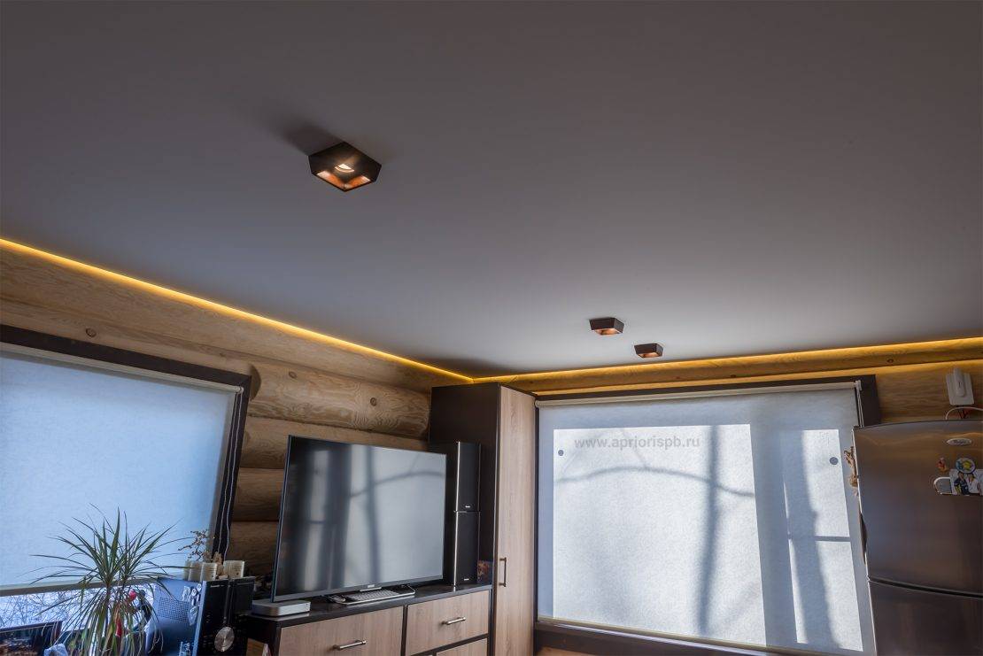 - Если потолки комнаты превышают 4 метра, необходимо установить натяжную систему на каркас, оставив 25–30 см пустого пространства.