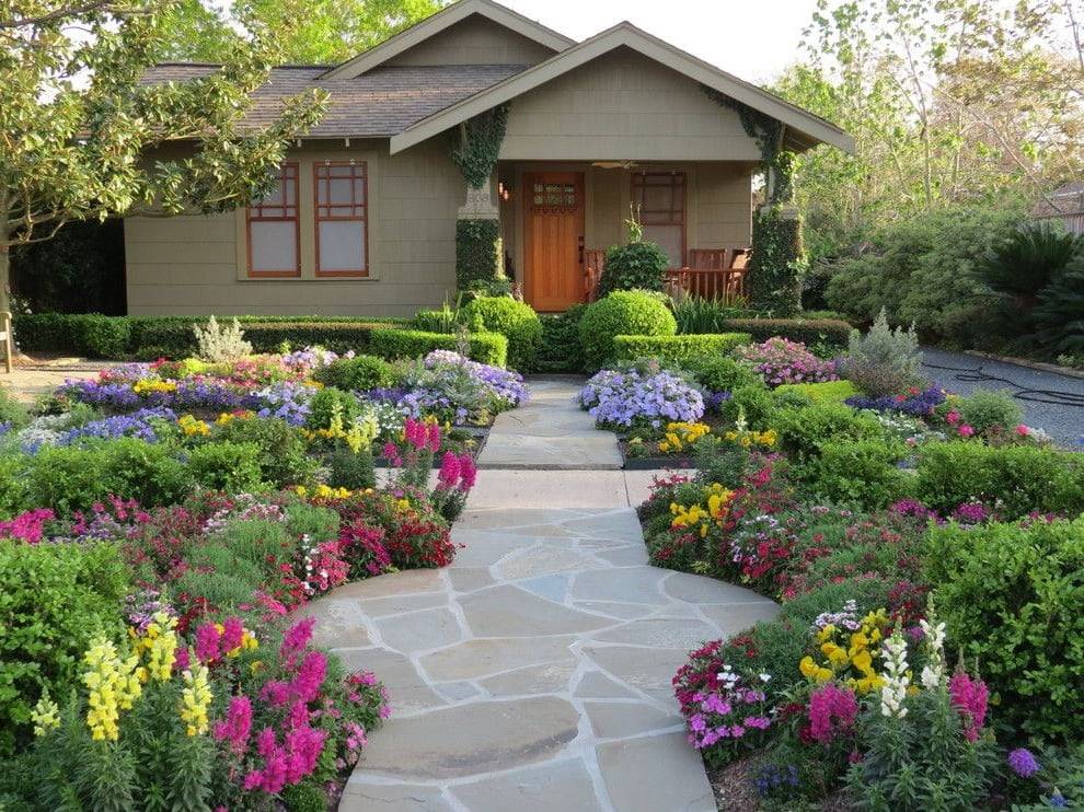 Необычное исполнение клумб на переднем дворе дома