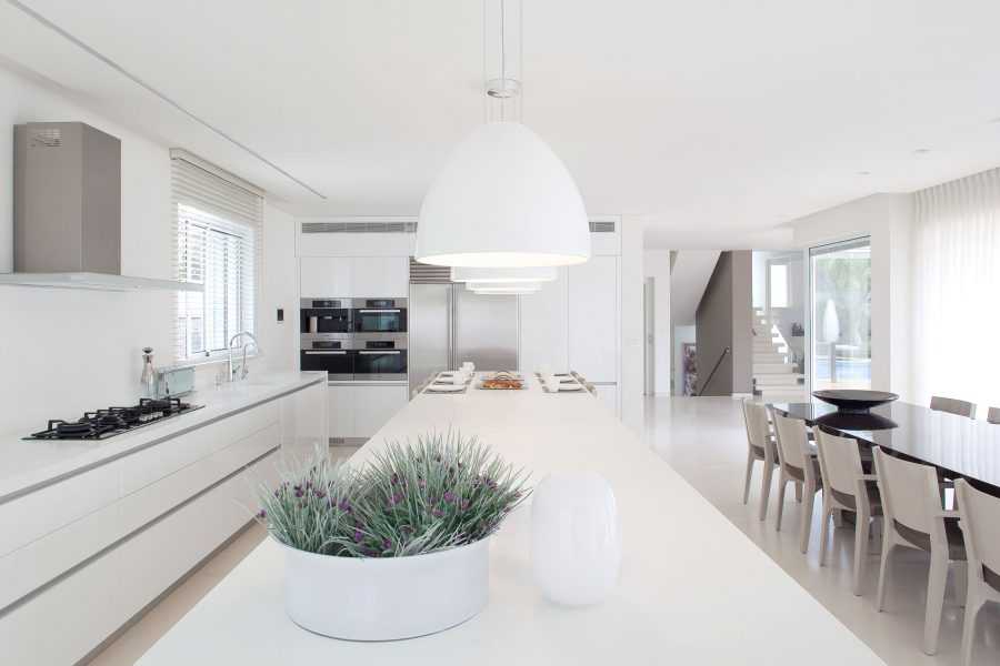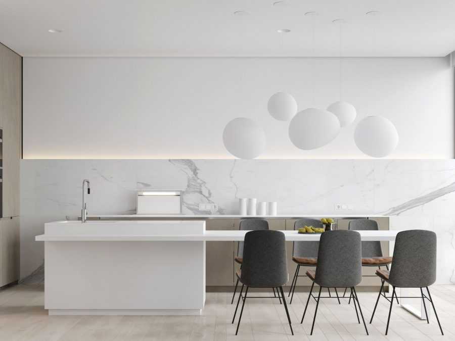 Это помещение в квартире должно сверкать в прямом и переносном смысле. Никаких лишних предметов, режущих глаз, не должно быть при стиле минимализм в интерьере кухни.