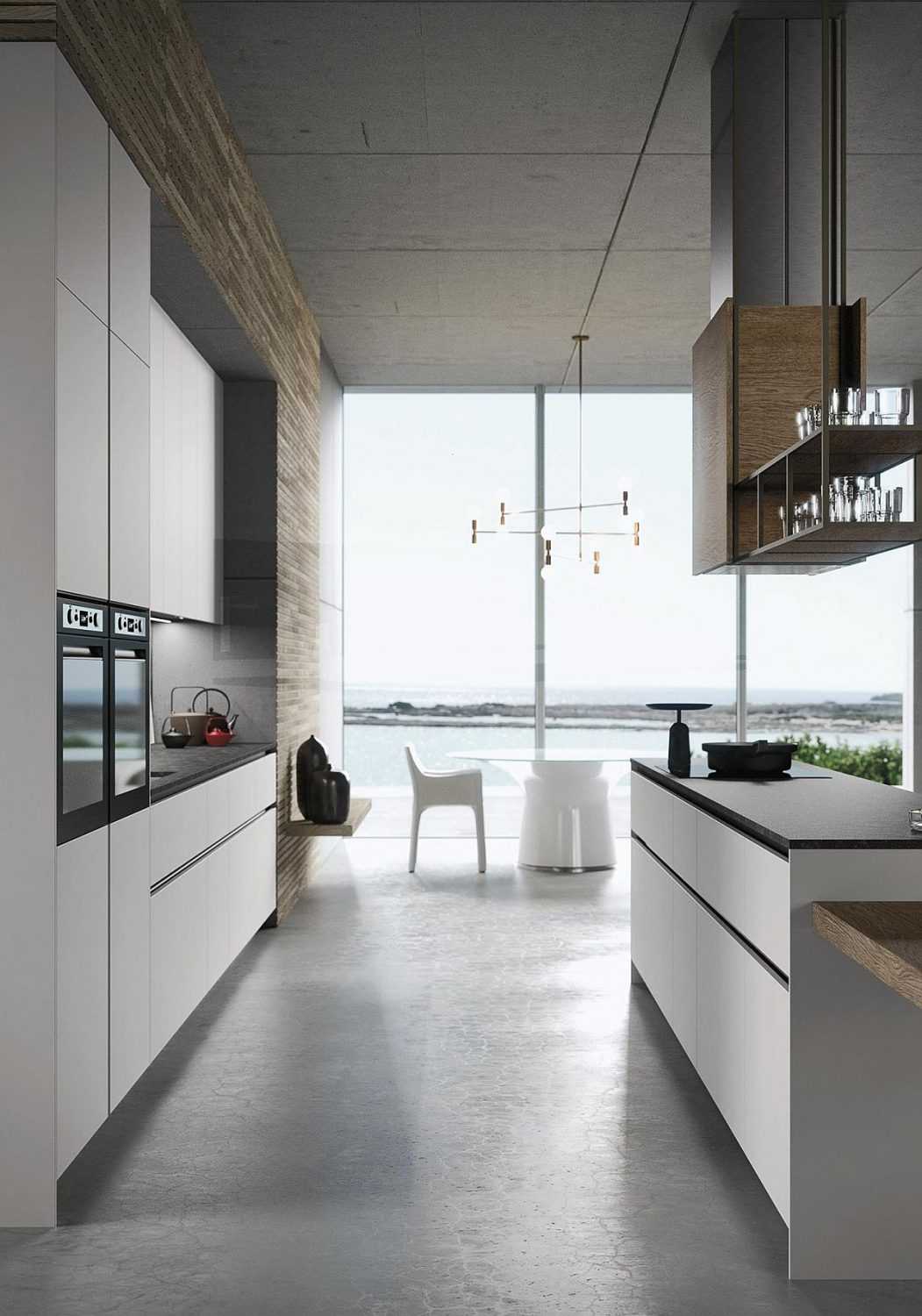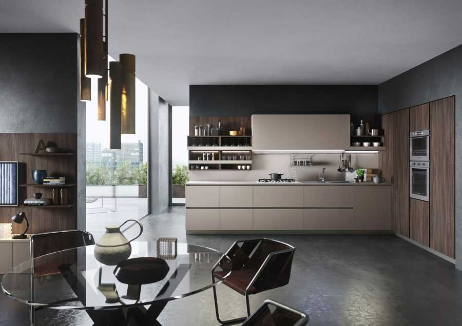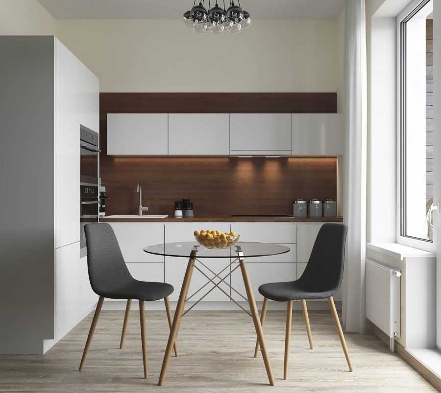 Встроенная техника не загромоздит пространство. На рынке представлен широкий выбор отделочных материалов для сборки кухонной мебели. Это может быть дерево или камень. Элементы лаконичного декора бывают из хромированной стали или выполненные из стекла.