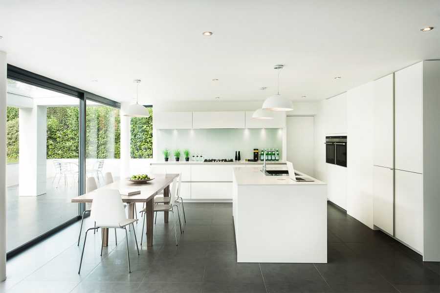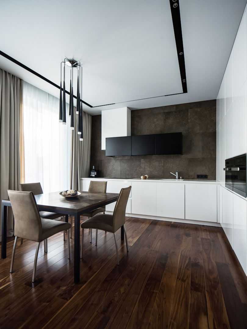 В качестве напольного покрытия часто используется паркет или керамическая плитка. Стилевой особенностью минимализма кухонной мебели является наличие простых форм.