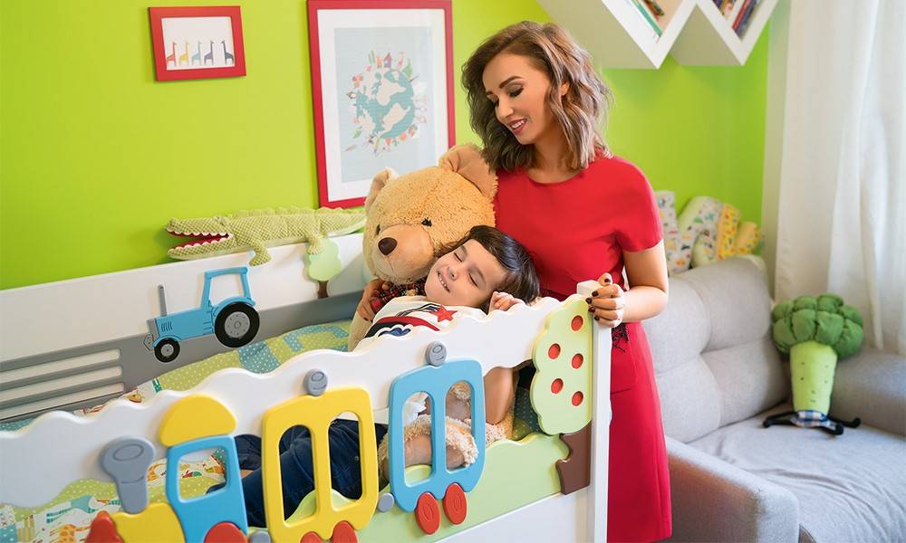Детская для сына небольшая, но грамотное распределение позволило обустроить в ней места для хранения, зону для игр и даже небольшую гардеробную. Цветовая гамма яркая – основным фоном выбран салатовый цвет, смягченный светлой мебелью и однотонным текстилем.