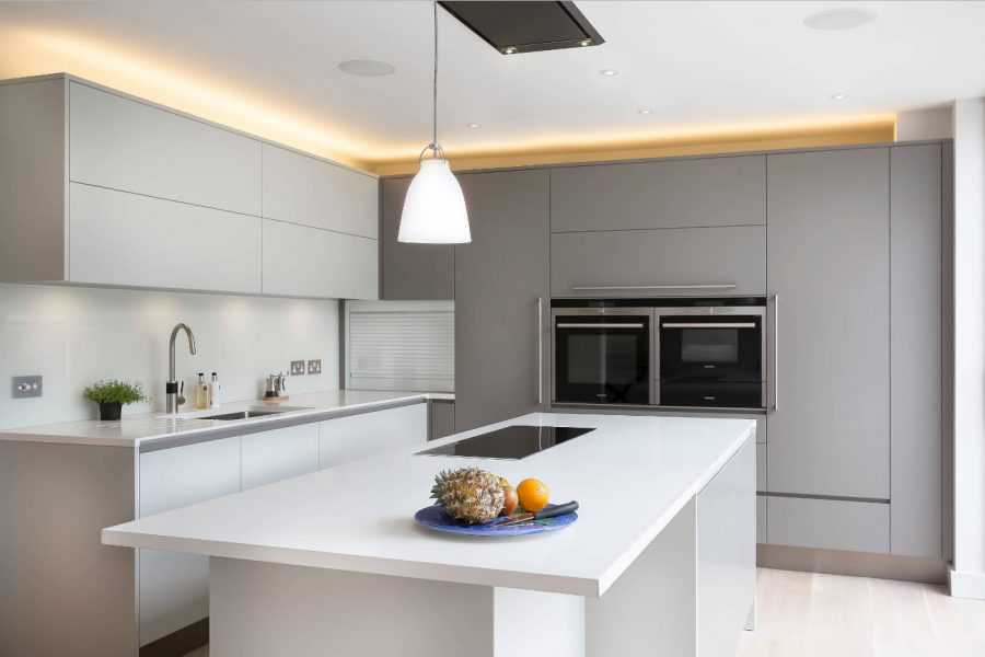 Целесообразно отдать предпочтение при отделке стен на кухне белому или молочному цвету. На фоне светлых стен будет гармонично смотреться мебель серых оттенков.