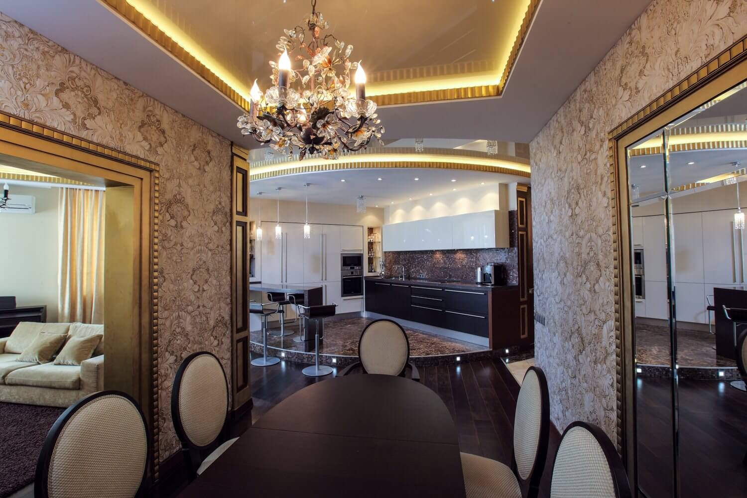 Натяжные потолки для арт-деко не подходят идеологически — это бюджетный вариант, нет смысла лезть в ремонт в очень дорогом стиле, чтобы потом экономить на потолках. Близко к никогда нельзя использовать глянцевые натяжные потолки в арт-деко. Стиль очень нагружен и без этого, умножение всего на 2 из-за отражения в потолке может всё испортить.