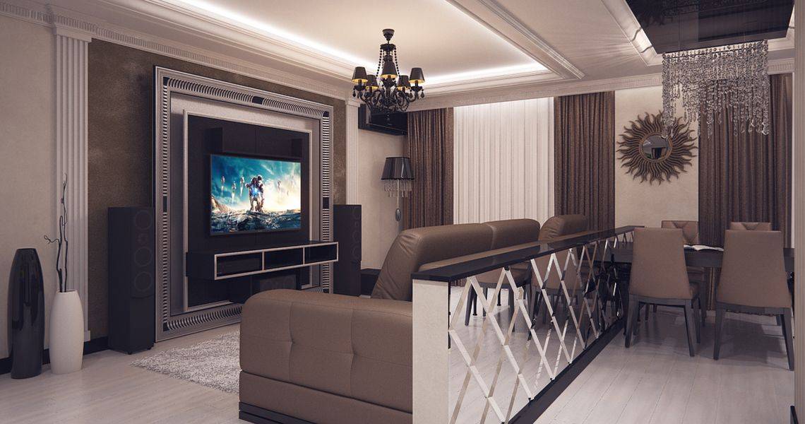 Многие предпочитают в таких комнатах некоторое осветление. Поэтому в идеале будет дополнить гостиную бежевым, кремовым или кофейным тоном. Его обычно применяют для отделки стен и потолков. Иногда он встречается и в декоре.