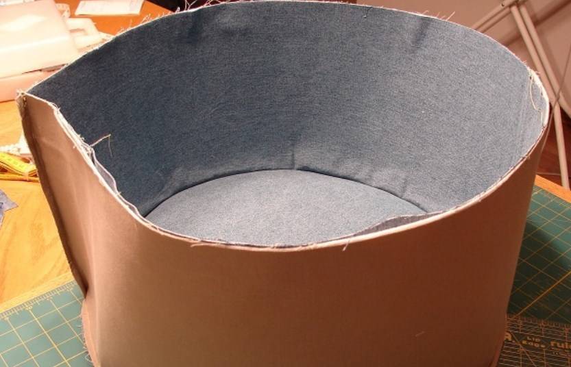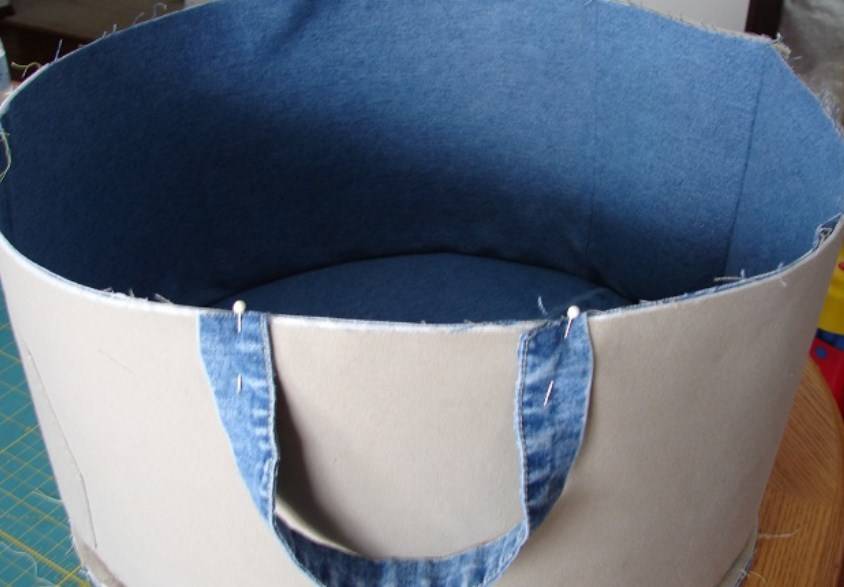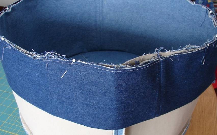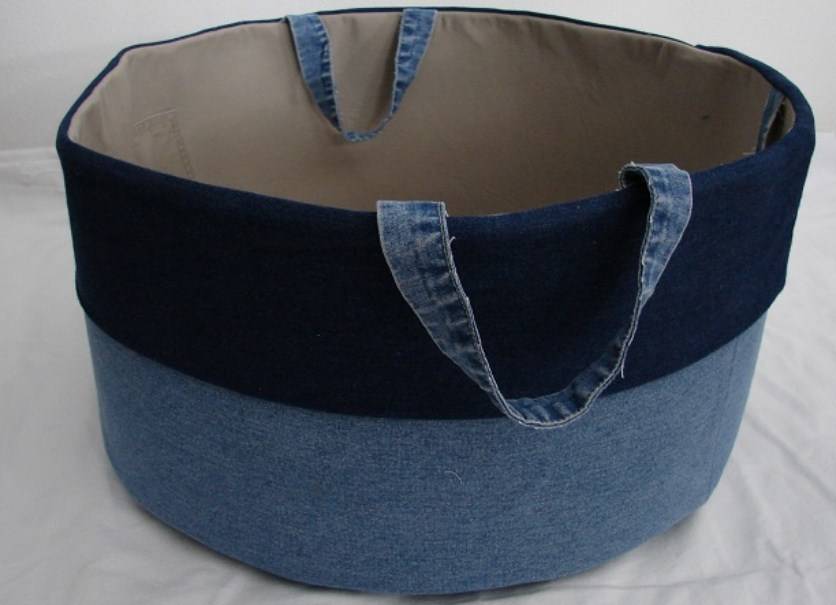 - Те 20 см, которые мы оставляли, сшиваем, то же – и на частях из подкладки, таким образом пришив крышку. Затем круг из подкладки пришить к стенкам и мы получим готовую подкладку. Поставив корзину крышкой вниз, вставить между джинсовой и подкладочной частями трубу из линолеума, предварительно обшитую синтепоном. Круг из джинсовой ткани нужно пришить к стенкам и дну приблизительно наполовину и вставить между днищами из джинса и ткани вырезанный из линолеума круг, который также обернут синтепоном. Дно пришиваем, используя потайной шов. Вот и все, корзинка из старых джинсов может радовать ребенка.