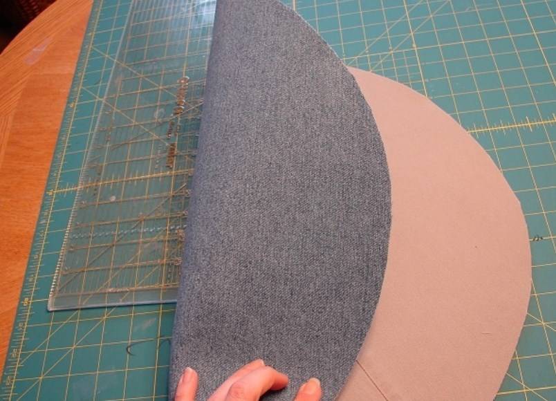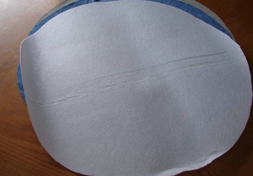 1. Из основной ткани вырезаем квадрат 40*40 см, простегиваем его на слимтексе и вырезаем круг диаметром 37 см уже в припусками, ничего добавлять не нужно.