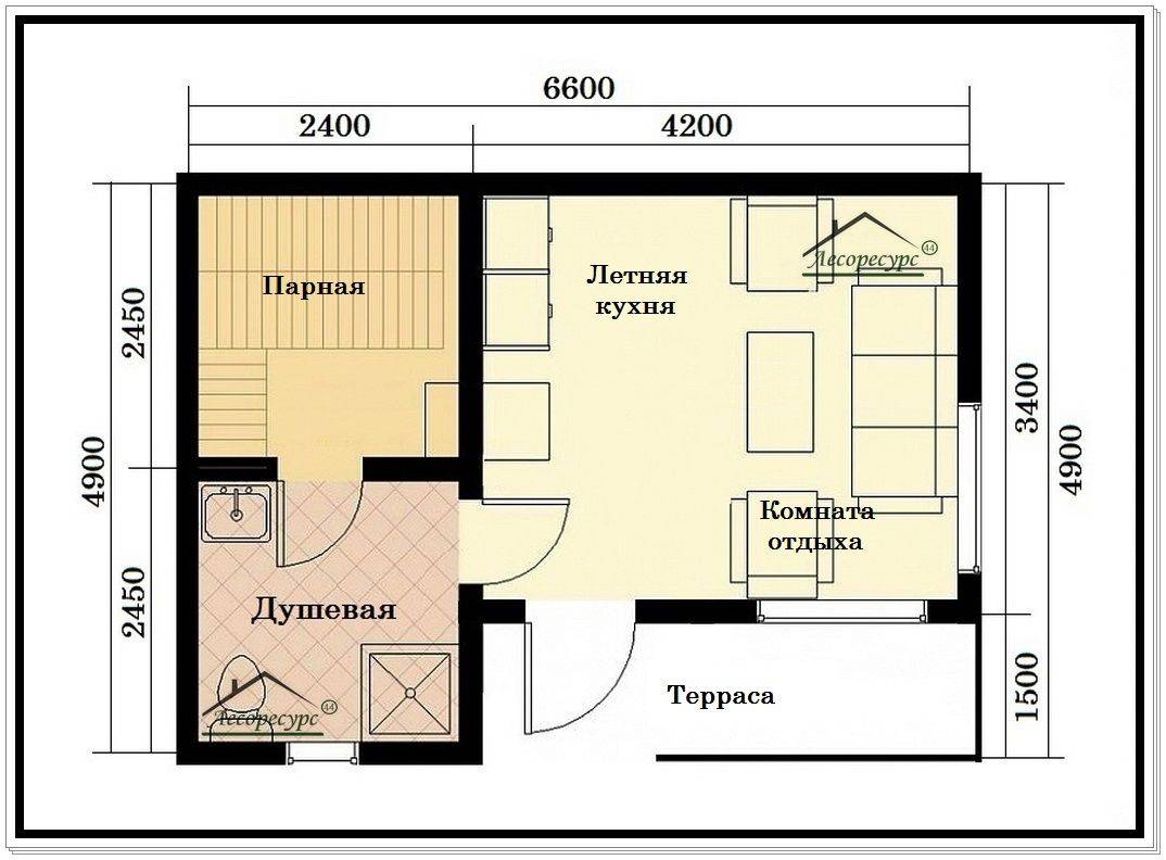 В наличии небольшая парная, проект содержит ее точные размеры 2400х2450 мм. К парной примыкает душевая таких же размеров. Есть летняя кухня 4200х3400 мм, разделенная на две функциональные зоны: приготовления пищи и отдыха. Ну и конечно, имеется небольшая терраса 4200х1500 мм, на которую можно выйти, подышать воздухом или устроить перекур.