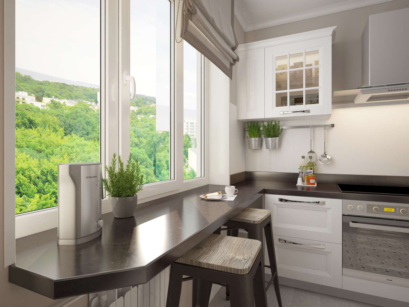 - Подоконник. По сути, подоконник сам по себе — уже готовая барная стойка, достаточно немного его расширить и поставить к нему стулья. Подходит для маленькой кухни, в которой негде развернуться совсем — станет отличной заменой громоздкого обеденного стола.